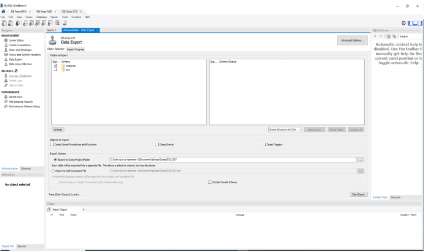 2. Setelah terbuka pada menu server klik kemudian gulir dan pilih Data Export, pada kolom Data Export centang database integrasi, kemudian klik tombol Start Export untuk memulai mencadangkan data, tunggu prosesnya hingga selesai.